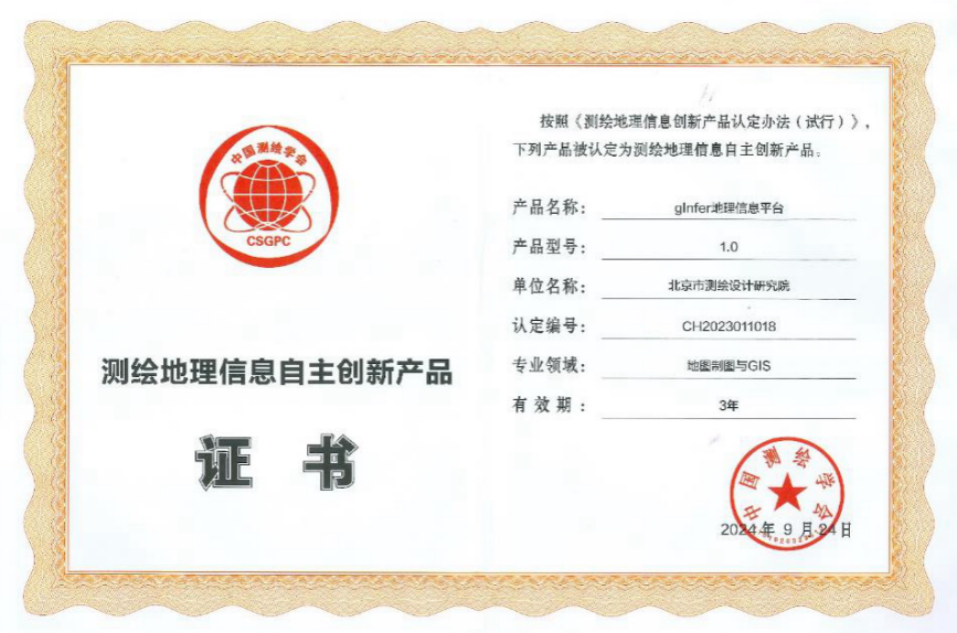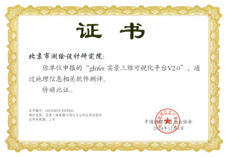 目前,gInfer平台已成功应用于首都核心区规划分析、数字中轴线、区级时空信息平台、洪涝灾害应急保障、自然资源调查监测、智慧社区等多个实际项目中,在提升项目管理效率和支持重大决策方面发挥了积极作用。该平台的建设与应用,不仅节约了可观的外采软件成本,也为国家重要地理信息数据的自主可控与安全使用提供了保障。2024年10月,gInfer通过中国测绘学会测绘地理信息自主创新产品认定,同年11月通过中国地理信息产业协会的实景三维可视化与分析软件测评,进一步体现了其技术先进性与应用价值。
