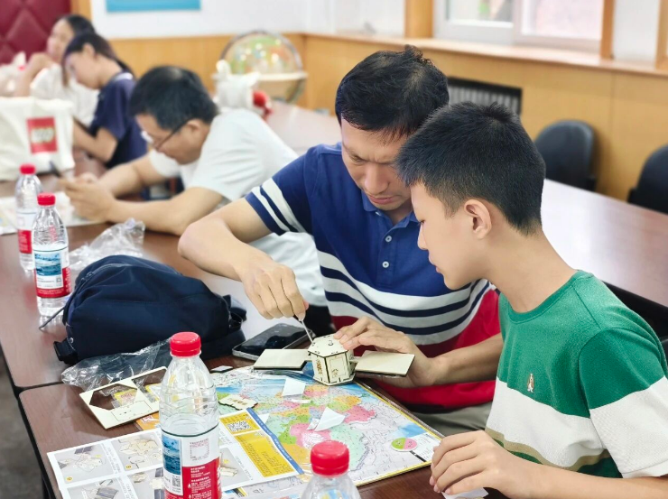 在专业老师指导下,大家迅速投入制作:有的结伴研究图纸、讨论方案;有的细致拆分材料、精准操作。从认识零件到逐步拼接,孩子们在动手实践中解锁卫星结构奥秘,每个步骤都充满挑战与乐趣。最终,一个个的太阳能卫星模型顺利完成。